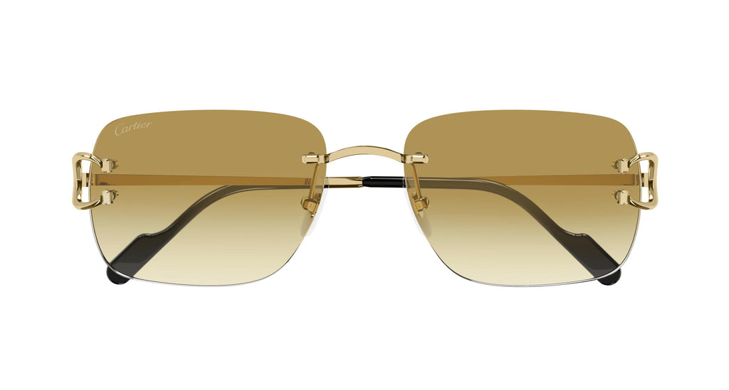 - THIS SQUARE CARTIER SUNGLASS COMES IN A SHINY GOLD FRAME WITH YELLOW GRADIENT LENSES.
