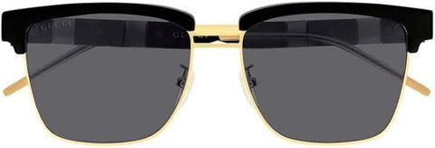 - THIS SQUARE GUCCI SUNGLASS COMES IN A BLACK AND GOLD FRAME WITH GREY LENSES.