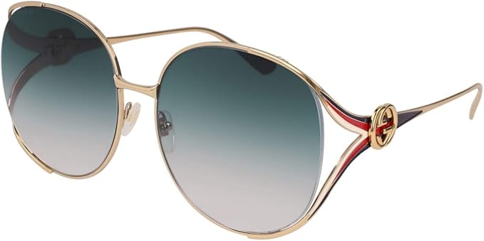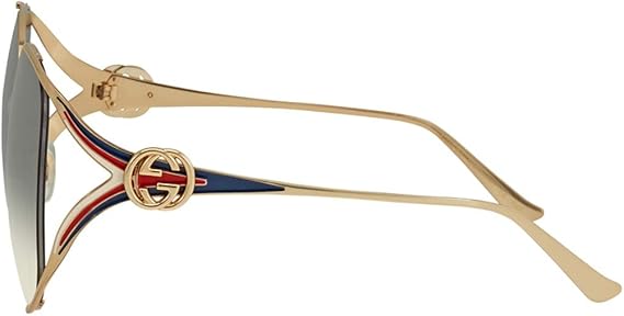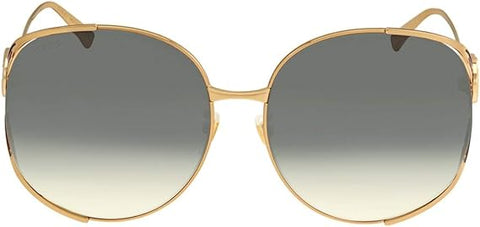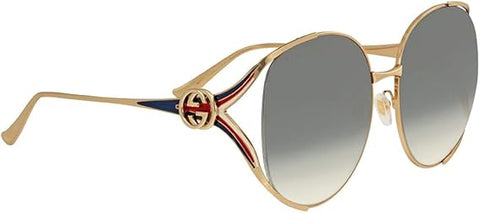 - GUCCI DESIGNER GLASSES & SUNGLASSES WOMEN URBAN INSPIRED LOOK FOR A GLAMOROUS AND FEMININE LOOK OVERSIZE OVAL SHAPE WITH A GOLD FRAME SURROUNDING GRADIENT LENSES IN CONTRAST WITH SOFT SHINY TEMPLES WITH GG INTERLOCKING LOGO FORK-SHAPED HINGES EMBELLISH THE TEMPLES WITH ICONIC GUCCI TONES GUCCI GG0225S SUNGLASSES.