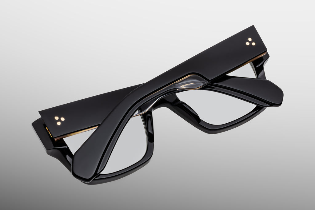 MATERIAL: BLACK 10MM CURED CELLULOSE ACETATE FRAME WITH CUSTOM DOUBLE LAMINATED ACETATE TEMPLES AND GREEN LENSES
