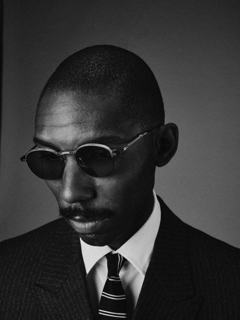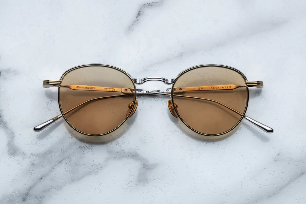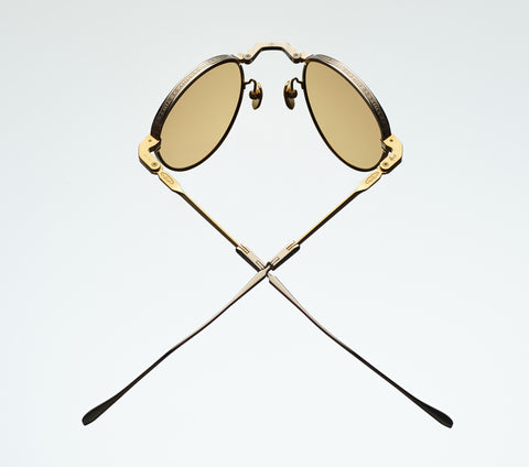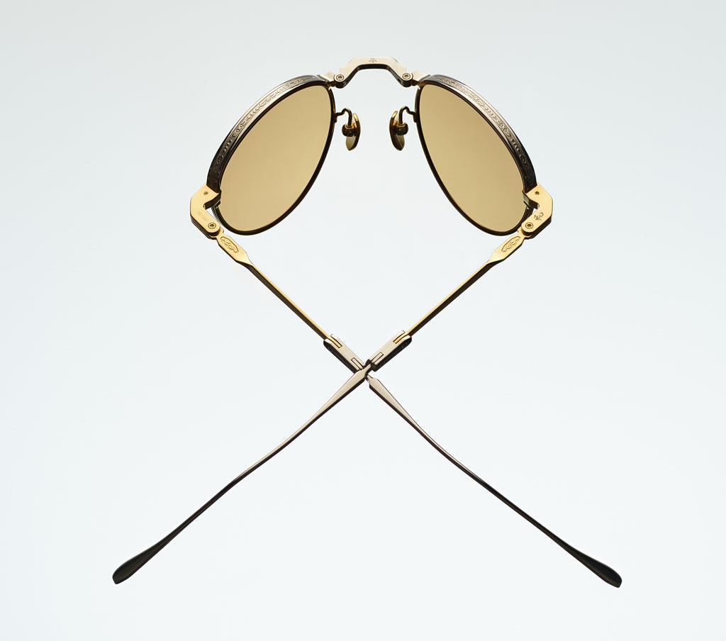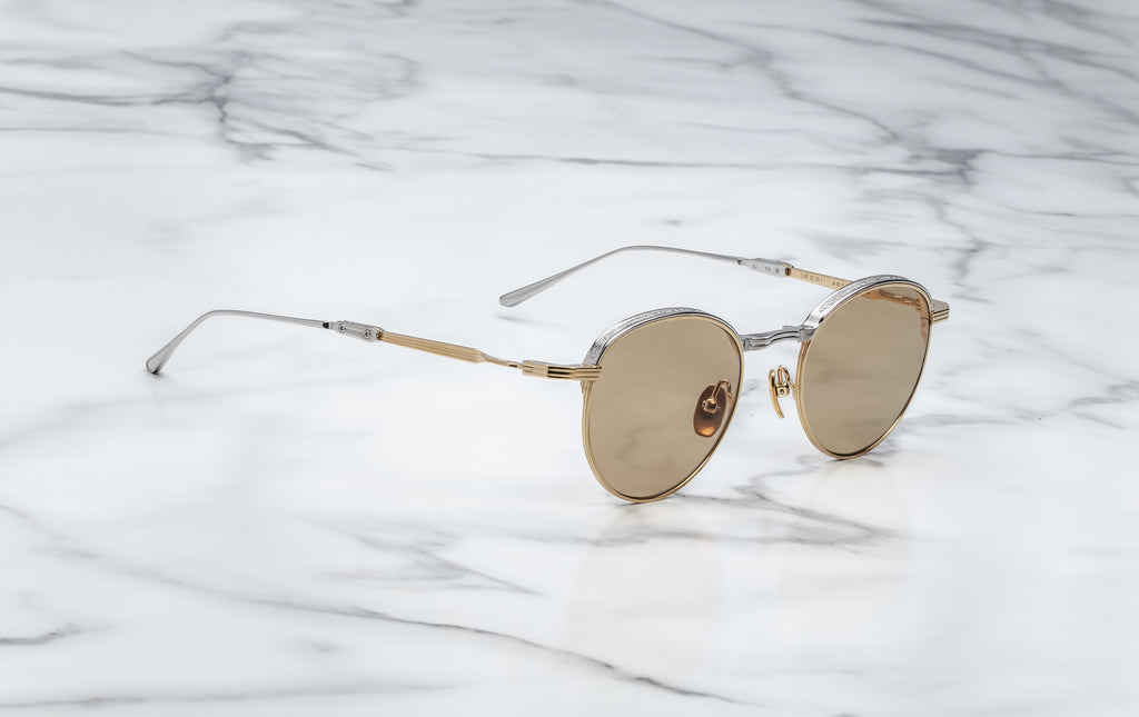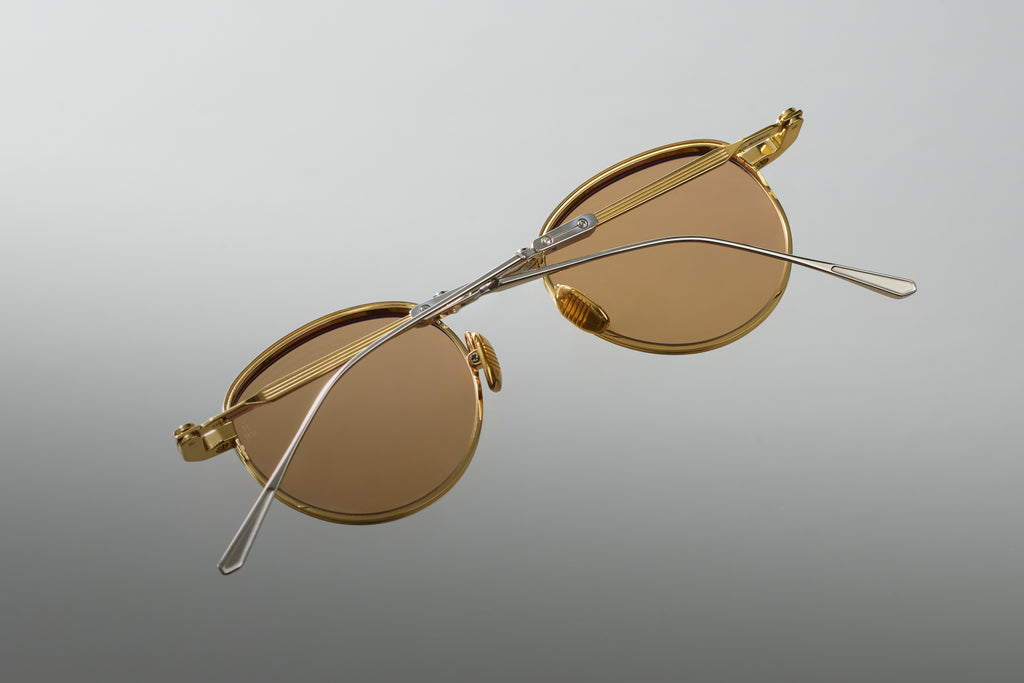 HARDWARE: SILVER AND MOON GOLD 100% BETA TITANIUM FRAME - LENS: BROWN LENSES - HANDCRAFTED IN JAPAN