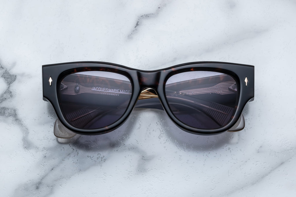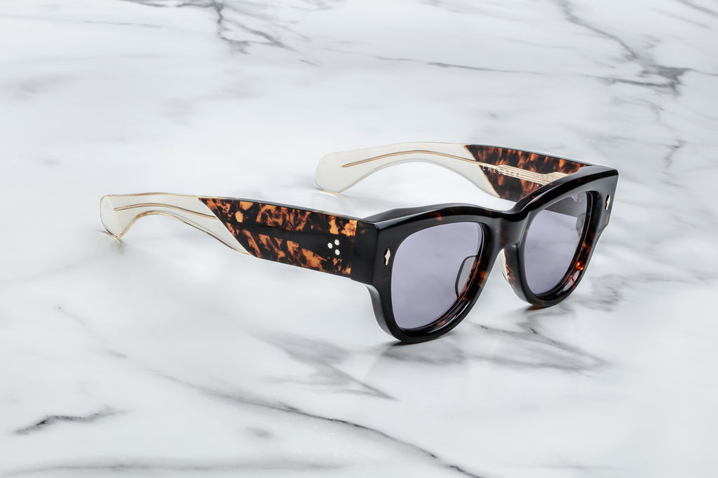 MATERIAL: HAVANA 10MM CURED CELLULOSE ACETATE FRAME W/ CUSTOM DOUBLE LAMINATED ACETATE TEMPLES FEATURING PRECIOUS METAL HARDWARE AND BLUE LENSES