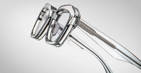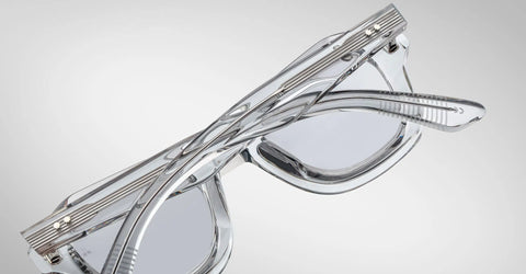 MATERIAL: SULFUR 10MM CURED CELLULOSE ACETATE FRAME WITH CUSTOM DOUBLE LAMINATED ACETATE TEMPLES FEATURING PRECIOUS METAL HARDWARE AND DOVE LIGHT GREY LENSES
