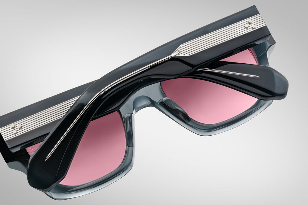 MATERIAL: 10MM BLOCK, GREY ACETATE FRAME, CUSTOM DOUBLE LAMINATED ACETATE TEMPLES FT. PRECIOUS METAL HARDWARE