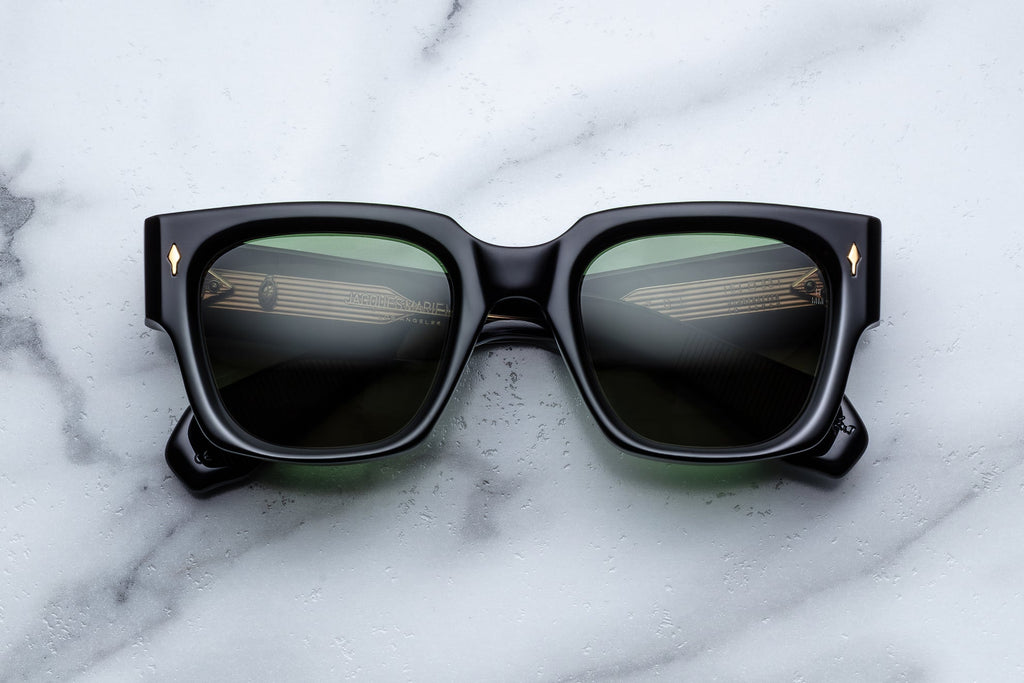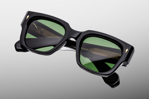 MATERIAL: BLACK 10MM CURED CELLULOSE ACETATE FRAME WITH CUSTOM DOUBLE LAMINATED ACETATE TEMPLES FEATURING PRECIOUS METAL HARDWARE AND GREEN LENSES