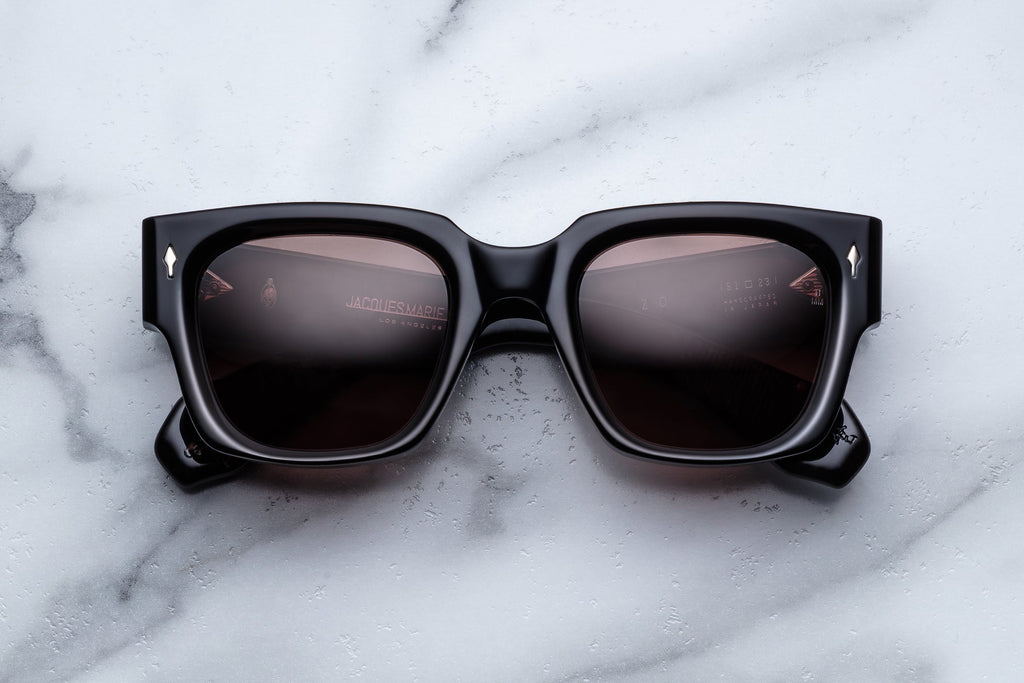 MATERIAL: BLACK 10MM CURED CELLULOSE ACETATE FRAME WITH CUSTOM DOUBLE LAMINATED ACETATE TEMPLES FEATURING PRECIOUS METAL HARDWARE AND BROWN LENSES