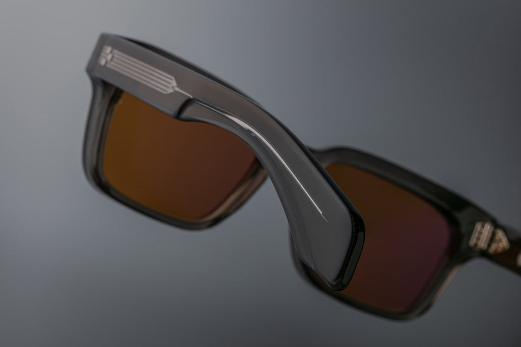 MATERIAL: 10MM BLOCK, POLISHED SMOKY CLEAR ACETATE FRAME, CUSTOM DOUBLE LAMINATED ACETATE TEMPLES FT. PRECIOUS METAL HARDWARE