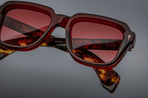 MATERIAL: 10MM RED ACETATE FRAME, CUSTOM DOUBLE LAMINATED TORTOISE ACETATE TEMPLES FT. PRECIOUS METAL HARDWARE