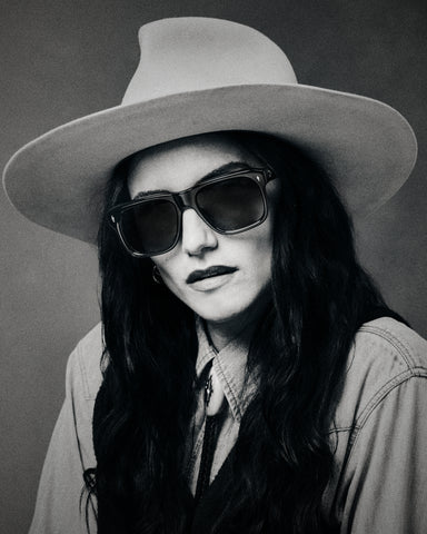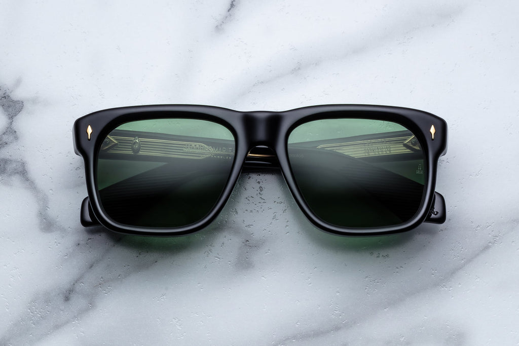 MATERIAL: BLACK 10MM CURED CELLULOSE ACETATE FRAME WITH CUSTOM DOUBLE LAMINATED ACETATE TEMPLES AND GREEN LENSES